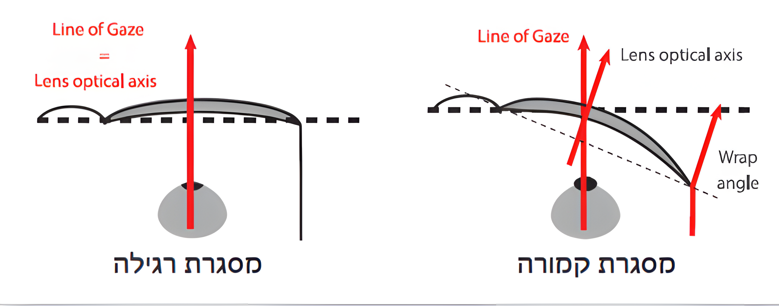 Frame comparison: In a regular frame the Gaze-of Line and the axis-optical Lens are aligned | In a convex frame there is an angle Wrap which causes a mismatch
